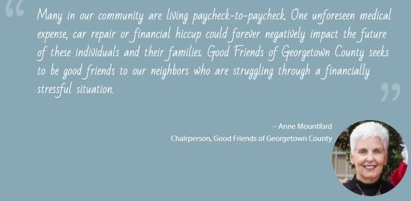 The recipients of the funds raised by Good Friends of Georgetown County are those who face a financial crisis that threatens basic human needs. One-time assistance is provided for food, shelter, medical expenses, utilities, transportation, etc. and is limited to $300/year/recipient. The recipients are determined by DSS.
